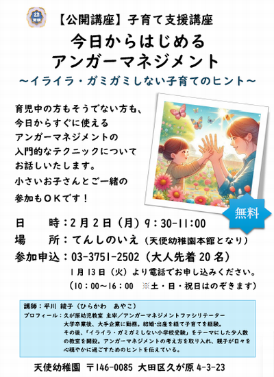 これらの講演会には、天使幼稚園関係の方だけでなく、どなたでも無料でご参加いただくことができます。事前に電話でお申込みの上、当日は上履き・靴袋をご持参下さい。駐輪場はございませんので、御協力お願いいたします。